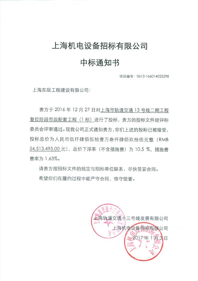 新聞動(dòng)態(tài) / News公司中標(biāo)13號(hào)線二期工程復(fù)位階段市政配套工程作者:魯瑞 來源: 日期:2017/1/10 14:44:37 人氣:3368